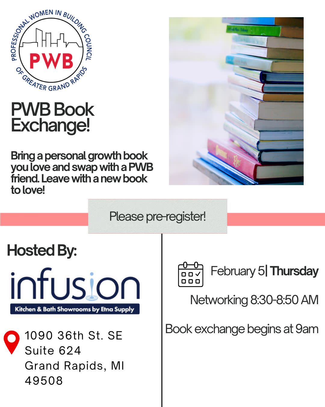 For our February PWB meeting, hosted by Infusion by Etna, we’re hosting a Book Exchange focused on personal development, leadership, and women’s empowerment — and we’d love for you to join us.